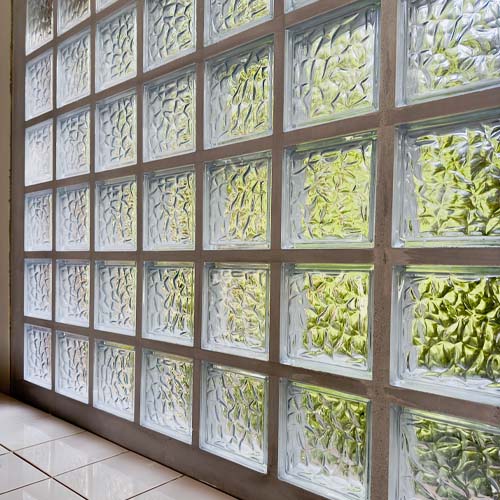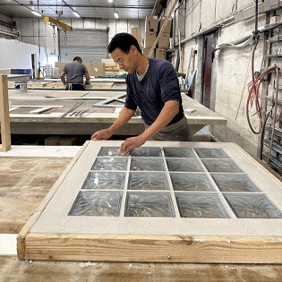Les panneaux préfabriqués sont réalisés à la main dans nos ateliers, avec des gestes experts et précis qui garantissent une finition régulière sublimant la vibrance de la lumière à travers le verre des briques et des pavés.