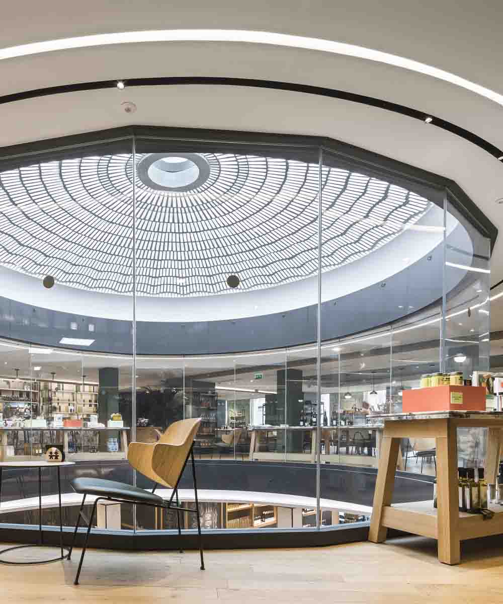 2336 lingots de verre identiques à ceux d’origine ont été coulés et pressés à la main selon le savoir-faire ancestral des maîtres verriers. Ils ont été placés sur un fond de coffrage réalisé au préalable avant d’être ferraillés et maçonnés à l’ancienne par l’entreprise SOREC. Cette nouvelle coupole en dentelle de verre identique à celle du début du 20ème siècle trône majestueusement au centre de la Grande Epicerie.